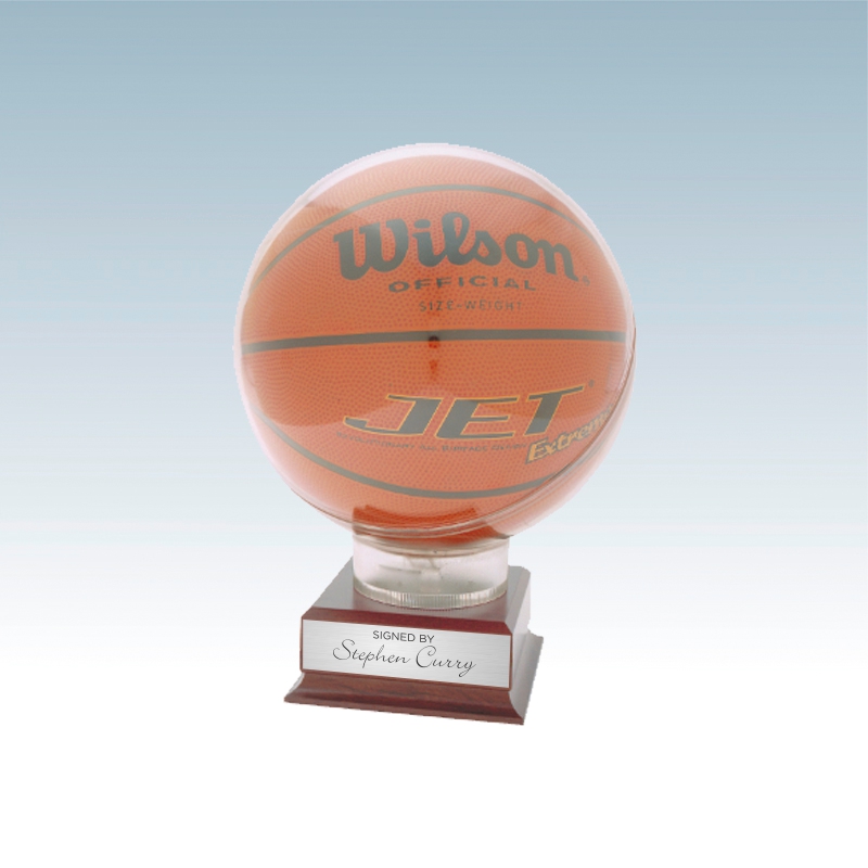 Pre-Assembled 13″ All Star Basketball Holders is a clear plastic basketball holder mounted to a Cherry Finish Base and come pre-assembled. Completed items individually boxed. Ball not included.