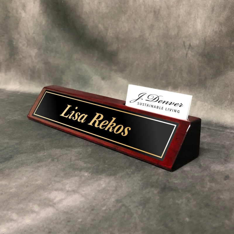 A rosewood piano finish desk wedge is an ideal solution for a professional environment. They feature a slot on top for holding business cards. This desk wedge includes a laser etched black over brass steel plate that can be engraved in a variety of fonts. Let us know your favorite and we will send you a proof. Plates are mounted permanently onto the desk wedge.