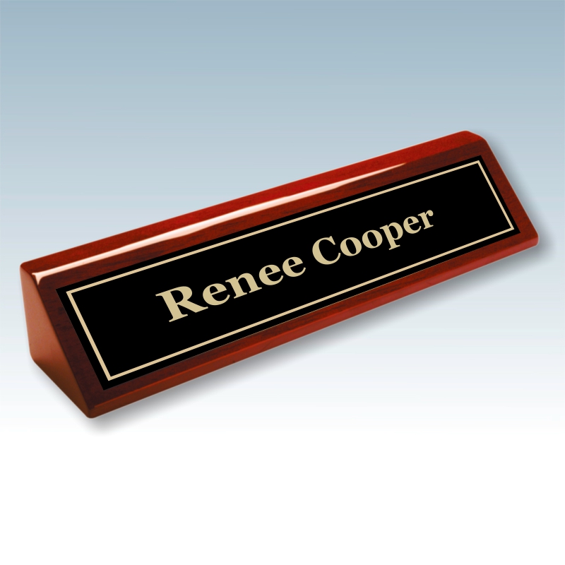 A rosewood piano finish desk wedge is an ideal solution for a professional environment. This desk wedge includes a laser etched black over brass steel plate that can be engraved in a variety of fonts. Let us know your favorite and we will send you a proof. Plates are mounted permanently onto the desk wedge.
