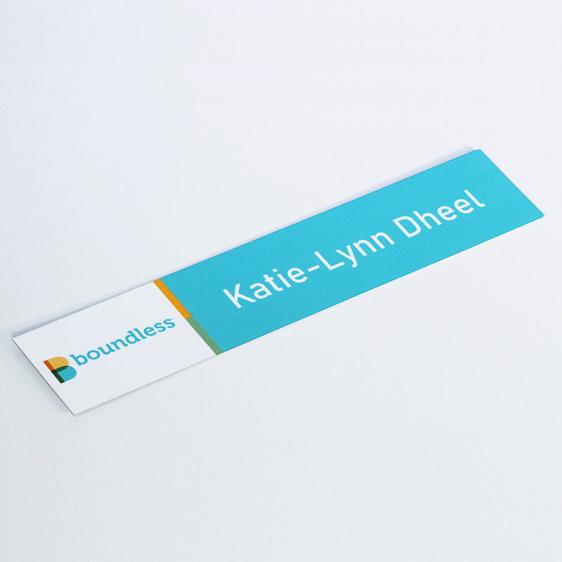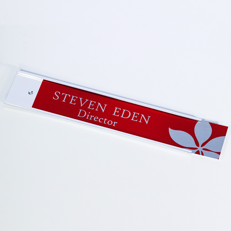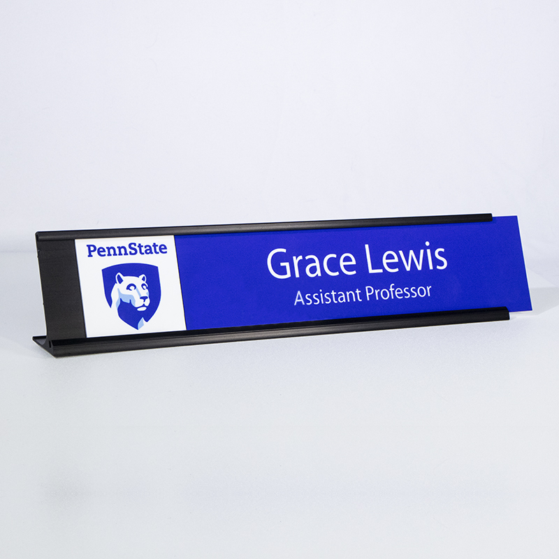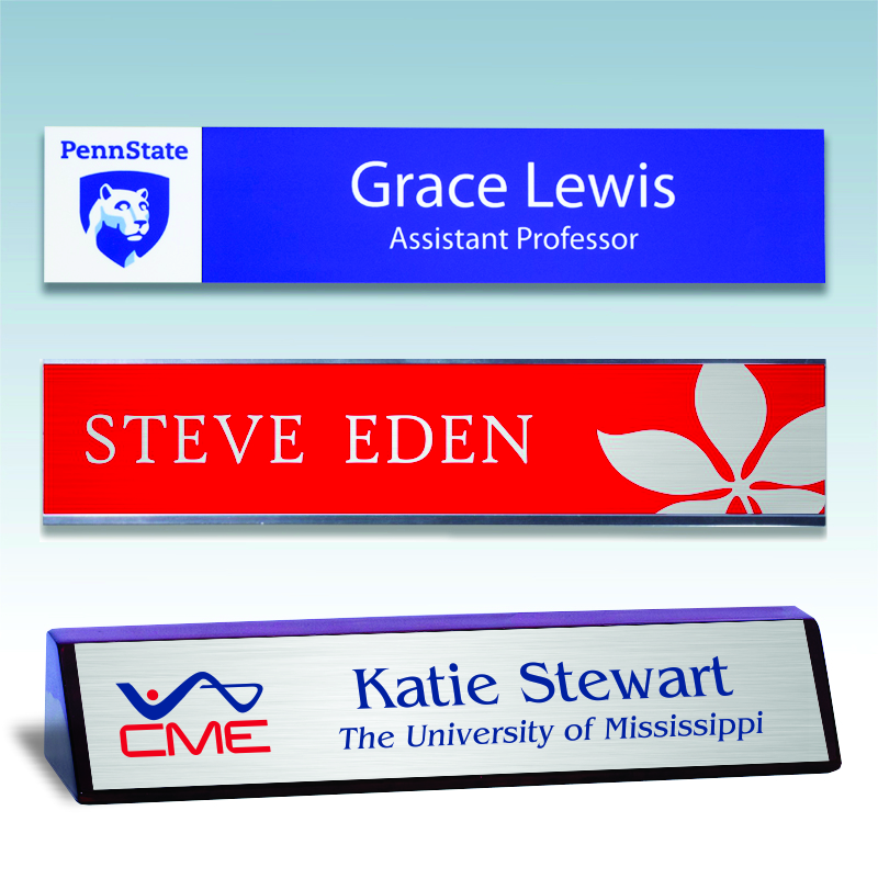 Each sublimated name plate is made from your choice of 1/16” thick gloss or matte metal. A logo or artwork can be digitally printed on the plate to show off your brand or message. The names will be printed right on the plate along with your logo. If you have a favorite font we should be able to match it or find one very similar. Other mount or holder options may be found below.