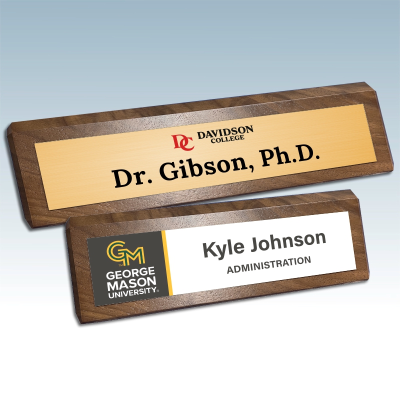A solid walnut desk wedge with a furniture finish is an ideal solution for a professional environment. This desk wedge includes a sublimated metal plate that can be fully customized with a full bleed. Plates are available with a glossy white, matte white, or a brushed silver finish. Plates are mounted permanently onto the desk wedge.